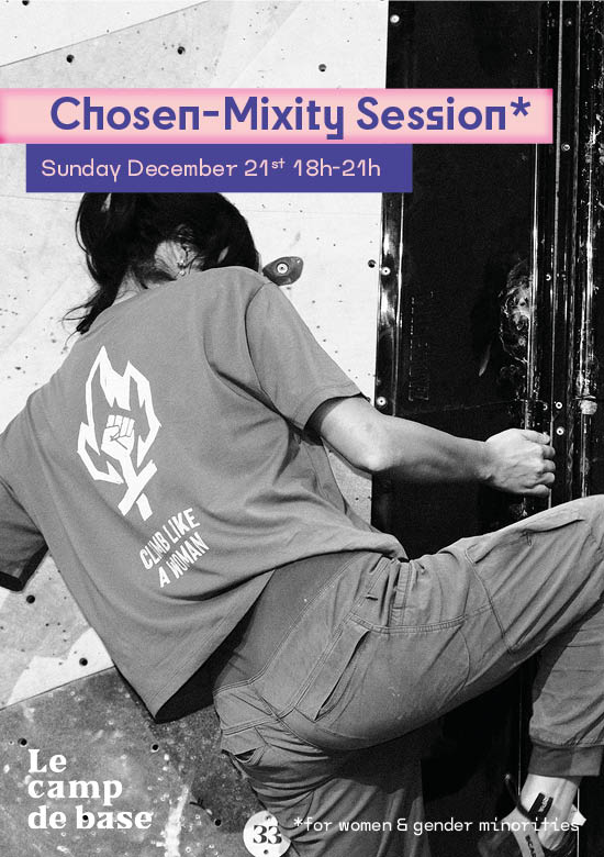 Le camp de base est à ce jour fréquenté majoritairement par des hommes (60%) et nous souhaitons créer un bouffée d’air pour que les personnes FINTA* puissent s’exprimer dans leur pratique de l’escalade, à l’abri des jugements et des comportements oppressifs. Ce moment est également l’occasion de créer des dynamique de sororité et permettre à ces personnes de s’approprier tout l’espace le temps d’une soirée.